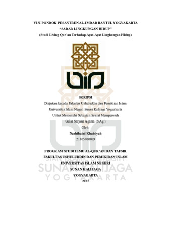 Nashihatul Khairiyah, NIM.: 21105030089 (2025) VISI PONDOK PESANTREN AL-IMDAD BANTUL YOGYAKARTA “SADAR LINGKUNGAN HIDUP” (STUDI LIVING QUR’AN TERHADAP AYAT-AYAT LINGKUNGAN HIDUP). Skripsi thesis, UIN SUNAN KALIJAGA YOGYAKARTA.