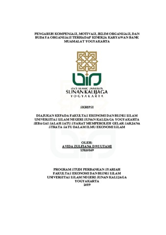AVIDA ZULFIANA DWI UTAMI, NIM. 15820169 (2019) PENGARUH KOMPENSASI, MOTIVASI, IKLIM ORGANISASI, DAN BUDAYA ORGANISASI TERHADAP KINERJA KARYAWAN BANK MUAMALAT YOGYAKARTA. Skripsi thesis, FAKULTAS EKONOMI DAN BISNIS.