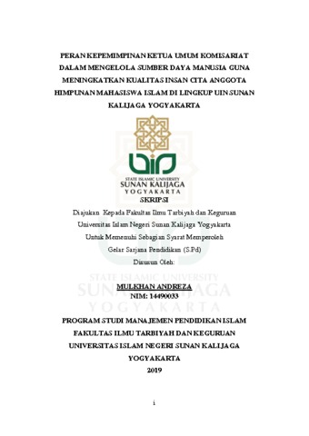 MULKHAN ANDREZA, NIM: 14490033 (2019) PERAN KEPEMIMPINAN KETUA UMUM KOMISARIAT DALAM MENGELOLA SUMBER DAYA MANUSIA GUNA MENINGKATKAN KUALITAS INSAN CITA ANGGOTA HIMPUNAN MAHASISWA ISLAM DI LINGKUP UIN SUNAN KALIJAGA YOGYAKARTA. Skripsi thesis, UIN Sunan Kalijaga.
