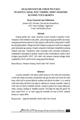 ANALISIS DAFTAR UMUR PIUTANG DI BAITUL MAAL WAT TAMWIL (BMT) MANDIRI SLEMAN YOGYAKARTA.pdf - Published Version Download (1MB) | Preview |