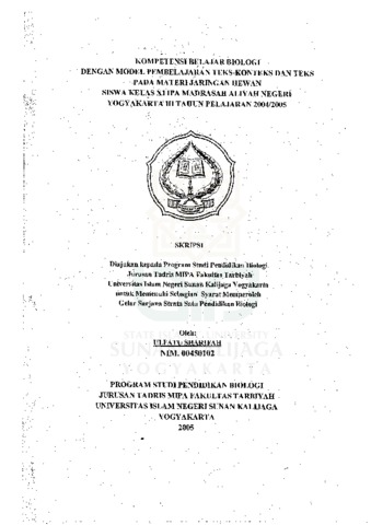 ULFATU SHARIFAH, NIM. 00450102 (2005) KOMPETENSI BELAJAR BIOLOGI DENGAN MODEL PEMBELAJARAN TEKS-KONTEKS DAN TEKS PADA MATERI .JARINGAN HEWAN SISWA KELAS XI IPA MADRASAH ALIYAH NEGERI YOGYAKARTA III TAHUN PELAJARAN 2004/2005. Skripsi thesis, UNIVERSITAS ISLAM NEGERI SUNAN KALIJAGA YOGYAKARTA.
