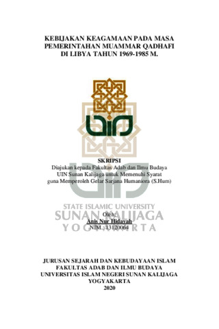Anis Nur Hidayah, NIM.: 13120064 (2020) KEBIJAKAN KEAGAMAAN PADA MASA PEMERINTAHAN MUAMMAR QADHAFI DI LIBYA TAHUN 1969-1985 M. Skripsi thesis, UIN SUNAN KALIJAGA YOGYAKARTA.