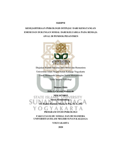 Difla Luluatul Mabruroh, NIM.: 16710015 (2020) KESEJAHTERAAN PSIKOLOGIS DITINJAU DARI KEMATANGAN EMOSI DAN DUKUNGAN SOSIAL DARI KELUARGA PADA REMAJA AWAL DI PONDOK PESANTREN. Skripsi thesis, UIN SUNAN KALIJAGA YOGYAKARTA.