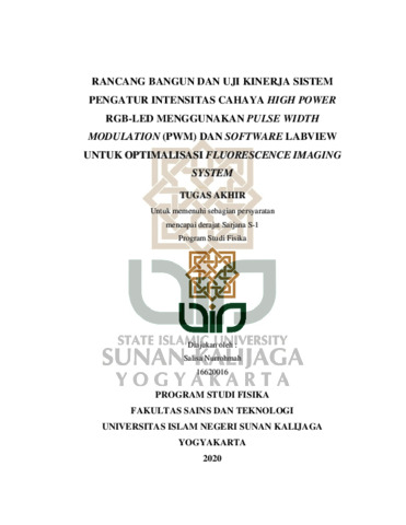 Salisa Nurrohmah, NIM.: 16620016 (2020) RANCANG BANGUN DAN UJI KINERJA SISTEM PENGATUR INTENSITAS CAHAYA HIGH POWER RGB-LED MENGGUNAKAN PULSE WIDTH MODULATION (PWM) DAN SOFTWARE LABVIEW UNTUK OPTIMALISASI FLUORESCENCE IMAGING SYSTEM. Skripsi thesis, UIN SUNAN KALIJAGA YOGYAKARTA.
