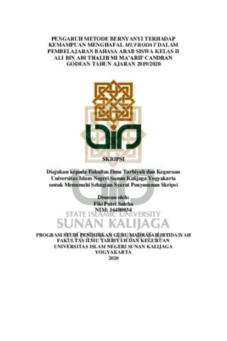 Fiki Putri Saleha, NIM.: 16480034 (2020) PENGARUH METODE BERNYANYI TERHADAP KEMAMPUAN MENGHAFAL MUFRODAT DALAM PEMBELAJARAN BAHASA ARAB SISWA KELAS II ALI BIN ABI THALIB MI MA’ARIF CANDRAN GODEAN TAHUN AJARAN 2019/2020. Skripsi thesis, UIN SUNAN KALIJAGA YOGYAKARTA.