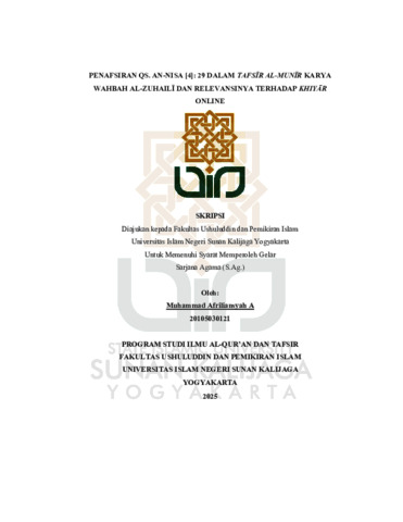 Muhammad Afriliansyah A, NIM.: 20105030121 (2025) PENAFSIRAN QS. AN-NISA [4]: 29 DALAM TAFSIR AL-MUNIR KARYA WAHBAH AL-ZUHAILI DAN RELEVANSINYA TERHADAP KHIYAR ONLINE. Skripsi thesis, UIN SUNAN KALIJAGA YOGYAKARTA.
