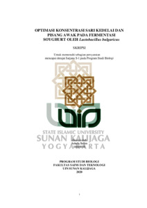 Arinda Safira, NIM.: 16640038 (2020) OPTIMASI KONSENTRASI SARI KEDELAI DAN PISANG AWAK PADA FERMENTASI SOYGHURT OLEH Lactobacillus bulgaricus. Skripsi thesis, UIN SUNAN KALIJAGA YOGYAKARTA.