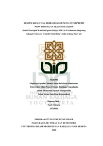 Naely Suhaela, NIM.: 16730116 (2020) RESEPSI KHALAYAK BERBASIS KOMUNITAS INTERPRETIF PADA POSTINGAN AKUN INSTAGRAM (Studi Deskriptif Kualitatif pada Pelajar SMAN 01 Salaman-Magelang sebagai Followers @nkcthi Nanti Kita Cerita tentang Hari ini). Skripsi thesis, UIN SUNAN KALIJAGA YOGYAKARTA.