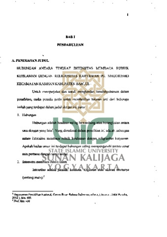 Text (HUBUNGAN ANTARA TINGKAT INTENSITAS MEMBACA RUBRIK KEISLAMAN DENGAN RELIGIUSITAS KARYAWAN PG. MADUKISMO KECAMATAN KASIHAN KABUPATEN BANTUL)