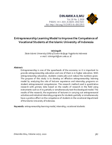 Istiningsih, - (2020) VOCATIONAL STUDENTS AT THE ISLAMIC ENTREPRENEURSHIP LEARNING MODEL TO IMPROVE THE COMPETENCE OF UNIVERSITY OF INDONESIA. DINAMIKA ILMU, 20 (2). pp. 367-382. ISSN P-ISSN: 1411-3031; E-ISSN: 2442-9651