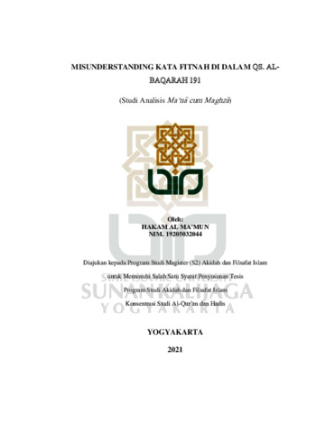 Pemahaman kata fitnah yang terdapat pada Qs. Al-Baqarah ayat 191 sering kali dinilai problematis ketika kata tersebut dimaknai sesuai konteks keindonesiaan. Kata fitnah dalam bahasa Indonesia dipahami sebagai satu kata untuk menggambarkan situasi dimana seseorang menisbatkan satu bertita yang tidak sesuai dengan faktanya. Padahal dalam bahasa aslinya, yakni bahasa Arab kata tersebut memiliki banyak arti sesuai konteks penggunaan kalimatnya. Sementara itu, kata fitnah di surah al-Baqarah ayat 191 apabila dimaknai sebagaimana kata fitnah dalam bahasa Indonesia maka akan bertentangan dengan satu hadis sahih yang menjelaskan tentang kategori dosa besar. Dosa besar itu antara lain: Syirik, sihir, membunuh. riba, makan harta anak yatim, kabur dari peperangan dan melemparkan tuduhan zina. Berangkat dari uraian tersebut maka tesis ini membahas tiga problem akademik. Pertama, apa isi kandungan surah al- Baqarah ayat 191 kaitannya dengan ayat-ayat fitnah di dalam al-Qur’an. Kedua, bagaimana makna Qs. al-Baqarah 191 dengan pengaplikasian pendekatan Ma’na Cum Maghza. Ketiga, mengapa terjadi kesalahpahaman di dalam memahami kata fitnah. Dalam penelitian ini, penulis menggunakan pendekatan Ma’na Cum Maghza sebagai analisis terhadap problem akademik yang hendak dipecahkan. Pendekatan ma’na cum maghza pertama kali mensyaratkan analisis kebahasaan dari ayat al-Qur’an yang hendak dikaji. Analisis kebahasan tersebut bisa dilakukan dengan mencari informasi melalui pendekatan intertekstual maupun intratekstual yakni dengan mengkaji literatur di luar teks al-Qur’an maupun melalui ayat-ayat lain yang masih satu tema. Setelah menemukan al-ma’na al-ta>rikhi dan al-Maghza alta> rikhi dari ayat 191 surah al-Baqarah kemudian penulis menentukan al- Ma’na al-Mutaharrik yakni makna yang dapat ditarik kepada konteks kekinian. Penelitian ini menemukan bahwa pendekatan ma’na cum maghza terhadap Qs. al-Baqarah ayat 191 menemukan tiga pesan utama yang dapat diterapkan dalam konteks kekinian yakni, pesan ketauhidan, pesan peneguhan terhadap prinsip maqashid al-syariah dan pesan etika bermuamalah atau berinteraksi antar umat manusia. Melalui penelitian ini penulis juga mengungkap bahwa makna kata fitnah yang sesuai dengan ayat 191 Qs. Al-Baqarah adalah kesyirikan. Sedangkan terjadinya kesalahpahaman terhadap makna kata fitnah dalam konteks masyarakat Indonesia lebih disebabkan karena simplifikasi atau penyederhanaan makna kata fitnah di dalam bahasa Arab. Kata fitnah dalam bahasa Indonesia tidak mampu mengakomodir makna yang terkandung di dalam Bahasa Arab.