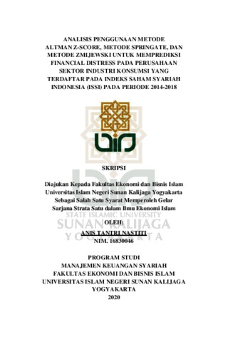 Anis Nastiti, NIM.: 16830046 (2020) ANALISIS PENGGUNAAN METODE ALTMAN Z-SCORE, METODE SPRINGATE, DAN METODE ZMIJEWSKI UNTUK MEMPREDIKSI FINANCIAL DISTRESS PADA PERUSAHAAN SEKTOR INDUSTRI KONSUMSI YANG TERDAFTAR PADA INDEKS SAHAM SYARIAH INDONESIA (ISSI) PADA PERIODE 2014-2018. Skripsi thesis, UIN SUNAN KALIJAGA YOGYAKARTA.