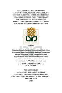 Text (ANALISIS PENGGUNAAN METODE ALTMAN Z-SCORE, METODE SPRINGATE, DAN METODE ZMIJEWSKI UNTUK MEMPREDIKSI FINANCIAL DISTRESS PADA PERUSAHAAN SEKTOR INDUSTRI KONSUMSI YANG TERDAFTAR PADA INDEKS SAHAM SYARIAH INDONESIA (ISSI) PADA PERIODE 2014-2018)