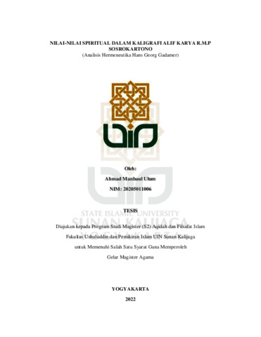 Ahmad Manbaul Ulum, NIM.: 20205011006 (2022) NILAI-NILAI SPIRITUAL DALAM KALIGRAFI ALIF KARYA R.M.P SOSROKARTONO (Analisis Hermeneutika Hans Georg Gadamer). Masters thesis, UIN SUNAN KALIJAGA YOGYAKARTA.