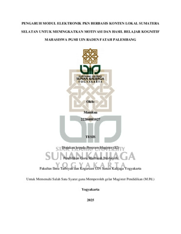 Mamkua, NIM.: 22204081027 (2025) PENGARUH MODUL ELEKTRONIK PKN BERBASIS KONTEN LOKAL SUMATERA SELATAN UNTUK MENINGKATKAN MOTIVASI DAN HASIL BELAJAR KOGNITIF MAHASISWA PGMI UIN RADEN FATAH PALEMBANG Oleh: Mamkua 22204081027 TESIS Diajukan kepada Program Magister (S2) Pendidikan Guru. Masters thesis, UIN SUNAN KALIJAGA YOGYAKARTA.