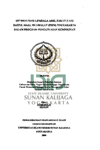 Nurkholis, NIM. 02231107 (2006) OPTIMALISASI LEMBAGA AMIL ZAKA T (LAZ) BAITUL MAAL MUAMALA T (BMM) YOGYAKARTA DALAM PROGRAM PENGENTASAN KEMISKINAN. Skripsi thesis, UIN SUNAN KALIJAGA YOGYAKARTA.