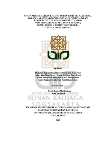 Ferda Rozaq Manihotana, NIM.: 08480036 (2012) UPAYA MENINGKATKAN KEAKTIFAN DAN HASIL BELAJAR SISWA DALAM MATA PELAJARAN IPA MELALUI PEMBELAJARAN KOOPERATIF TIPE JIGSAW (MODEL TIM AHLI) PADA SISWAKELAS IV ABU BAKAR AS-SHIDIQ DI MIN JEJERAN BANTUL YOGYAKARTA TAHUN AJARAN 2011/2012. Skripsi thesis, UIN SUNAN KALIJAGA YOGYAKARTA.