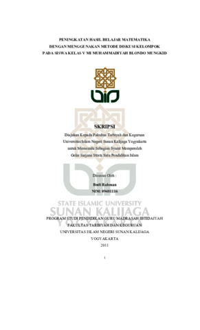 Budi Rahman, NIM.: 09481116 (2011) PENINGKATAN HASIL BELAJAR MATEMATIKA DENGAN MENGGUNAKAN METODE DISKUSI KELOMPOK PADA SISWA KELAS V MI MUHAMMADIYAH BLONDO MUNGKID. Skripsi thesis, UIN SUNAN KALIJAGA YOGYAKARTA.