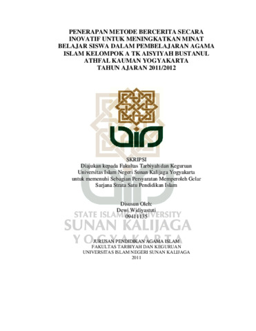 Dewi Widiyastuti, NIM.: 09411135 (2011) PENERAPAN METODE BERCERITA SECARA INOVATIF UNTUK MENINGKATKAN MINAT BELAJAR SISWA DALAM PEMBELAJARAN AGAMA ISLAM KELOMPOK A TK AISYIYAH BUSTANUL ATHFAL KAUMAN YOGYAKARTA TAHUN AJARAN 2011/2012. Skripsi thesis, UIN SUNAN KALIJAGA YOGYAKARTA.