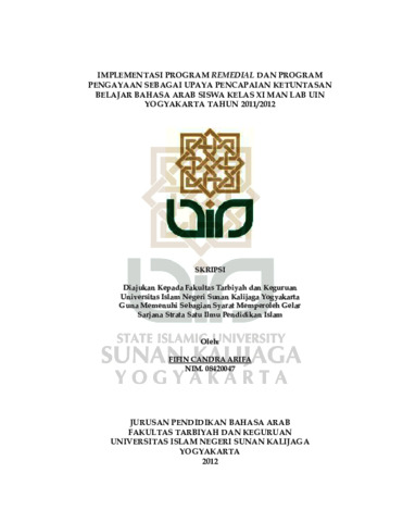 Fifin Candra Arifa, NIM.: 08420047 (2012) IMPLEMENTASI PROGRAM REMEDIAL DAN PROGRAM PENGAYAAN SEBAGAI UPAYA PENCAPAIAN KETUNTASAN BELAJAR BAHASA ARAB SISWA KELAS XI MAN LAB UIN YOGYAKARTA TAHUN 2011/2012. Skripsi thesis, UIN SUNAN KALIJAGA YOGYAKARTA.