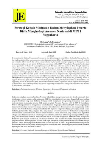 Dalam menyiapkan Asesmen/Penilaian Nasional dibutuhkan strategi yang tepat dari kepala madrasah demi terlaksananya proses asesmen sehingga peserta didik bisa mengikuti proses assesmen dengan baik tanpa kendala apapun. Penelitian yang akan dilakukan bertujuan untuk mengetahui strategi yang dipersiapkan oleh kepala madrasah dalam menyiapkan peserta didik untuk mengikuti Asesmen Nasional (AN) di MIN 1 Yogyakarta. Metode dalam penelitian ini menggunakan metode kualitatif dengan pendekatan deskriptif. Sistem pengumpulan data dilakukan melalui metode wawancara, observasi dan dokumentasi. Teknik analisis data menggunakan model analisis data Miles Huberman sebagaimana dikutip oleh Sugiyono yang terdiri 3 (tiga) proses yang terjadi secara berkaitan, yaitu reduksi data, penyajian data, dan penarikan kesimpulan/verifikasi. Berdasarkan hasil penelitian terlihat bahwa Asesmen Nasional didesain untuk memetakan sistem pendidikan yang nantinya akan digunakan sebagai acuan dalam memperbaiki serta mengevaluasi kualitas pendidikan dalam setiap satuan pendidikan. Upaya yang dilakukan kepala madrasah untuk mempersiapkan siswa saat menghadapi AKM (Asesmen Kompetensi Minimum) yaitu dengan memberikan jam belajar tambahan serta memfasilitasi buku penunjang keberhasilan program tersebut. Namun program tersebut tidak dapat diterapkan secara penuh/maksimal dikarenakan adanya pandemi. Faktor penunjang dalam keberhasilan Asesmen Nasional di MIN 1 Yogyakarta adalah dukungan dan kesediaan kepala madrasah dalam bertanggungjawab serta fasilitas buku penunjang yang khusus untuk diberikan kepada guru dan siswa Asesmen Nasional.