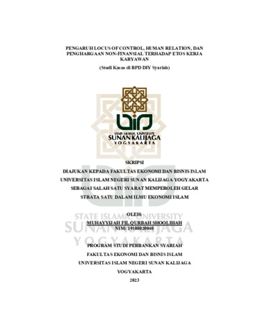 Muhayyijah Fil Qurbah Shoolihah, NIM.: 19108020040 (2023) PENGARUH LOCUS OF CONTROL, HUMAN RELATION, DAN PENGHARGAAN NON-FINANSIAL TERHADAP ETOS KERJA KARYAWAN (Studi Kasus di BPD DIY Syariah). Skripsi thesis, UIN SUNAN KALIJAGA YOGYAKARTA.