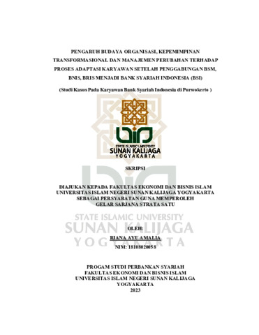 Riana Ayu Amalia, NIM.: 18108020058 (2023) PENGARUH BUDAYA ORGANISASI, KEPEMIMPINAN TRANSFORMASIONAL DAN MANAJEMEN PERUBAHAN TERHADAP PROSES ADAPTASI KARYAWAN SETELAH PENGGABUNGAN BSM, BNIS, BRIS MENJADI BANK SYARIAH INDONESIA (BSI) (STUDI KASUS PADA KARYAWAN BANK SYARIAH INDONESIA DI PURWOKERT. Skripsi thesis, UIN SUNAN KALIJAGA YOGYAKARTA.