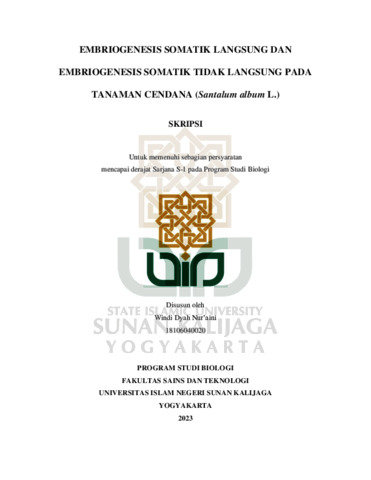 Windi Dyah Nur’aini, NIM.: 18106040020 (2023) EMBRIOGENESIS SOMATIK LANGSUNG DAN EMBRIOGENESIS SOMATIK TIDAK LANGSUNG PADA TANAMAN CENDANA (Santalum album L.). Skripsi thesis, UIN SUNAN KALIJAGA YOGYAKARTA.