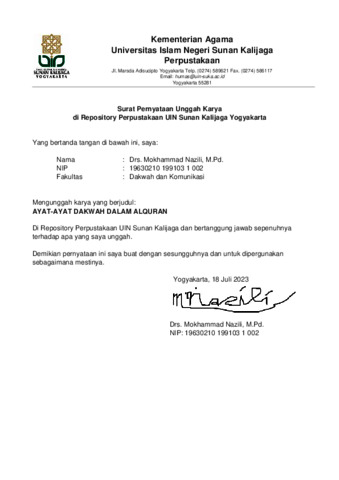 AYAT-AYAT DAKWAH DALAM AL QURAN, Mokh Nazili, Fakultas Dakwah Universitas Islam Negeri Sunan Kalijaga Yogyakarta, 2023 Penelitian ini diilatarbelakangi oleh langkanya buku daras tentang ayat-ayat dakwah bagi mahasiswa utamanya mahasiswa Fakultas Dakwah dan Komunikasi UIN Sunan Kalijaga Yogyakarta Program Studi Manajemen Dakwah. Pengetahuan tentang ayat-ayat dakwah menjadi penting diketahui mahasiswa supaya akar ajaran dakwah dari Al Quran menginspirasi sekaligus menjadi dasar dalam praktek dakwah. Mahasiswa tahu batas-batas dakwah, hikmah dakwah, metode dakwah dan sebagainya yang berhubungan dakwah dari Al Quran. Metode yang digunakan adalah dengan metode tematik ( maudhu’i ) yakni metode yang membahas ayat-ayat Al Quran sesuai dengan tema atau judul yang ditetapkan. Semua ayat yang berkaitan dihimpun, kemudian dikaji secara mendalam dan tuntas dari berbagai aspek yang terkait dengannya. Hasil penelitian ini adalah terbukukannya ayat-ayat dakwah dalam dalam empat bab. Bab satu berisi tentang kewajiban dakwah bagi setiap muslim sesuai dengan kempuannya, ancaman yang tidak mau berdakwah dan tugas utama para rasul. Bab dua berisi tentang hikmah dalam berdakwah yang membahas dakwah wajib dilakuakan dengan bijaksana, dakwah dengan bahasa yang bisa dipahami, berbantahan dengan cara yang baik, membalasa kejahatan dengan kebaikan, larangan memaki orang kafir. Bab ketiga berisi tentang batasan-batasan dakwah yang memuat tidak ada paksaan dalam beragama, tidak boleh berlebihan dalam beragama, tekanan akidah adalah aniaya, jangan fanati dalam beragama, bersikap keras denga orang kafir yang memerangi, terakhir mempermudah urusan orang Islam.
