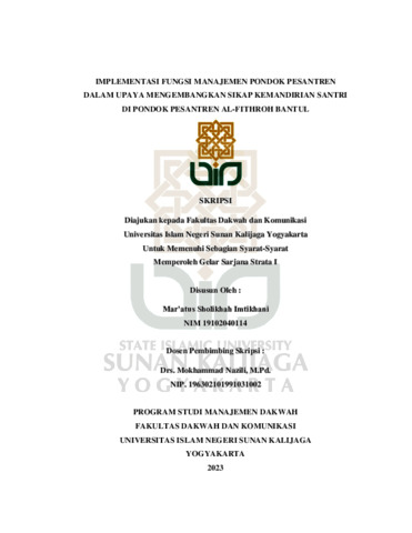 Mar’atus Sholikhah Imtikhani, NIM.: 19102040114 (2023) IMPLEMENTASI FUNGSI MANAJEMEN PONDOK PESANTREN DALAM UPAYA MENGEMBANGKAN SIKAP KEMANDIRIAN SANTRI DI PONDOK PESANTREN AL-FITHROH BANTUL. Skripsi thesis, UIN SUNAN KALIJAGA YOGYAKARTA.