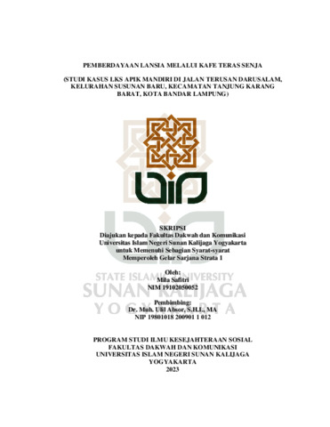 Mila Safitri, NIM.: 19102050052 (2023) PEMBERDAYAAN LANSIA MELALUI KAFE TERAS SENJA (STUDI KASUS LKS APIK MANDIRI DI JALAN TERUSAN DARUSALAM, KELURAHAN SUSUNAN BARU, KECAMATAN TANJUNG KARANG BARAT, KOTA BANDAR LAMPUNG). Skripsi thesis, UIN SUNAN KALIJAGA YOGYAKARTA.
