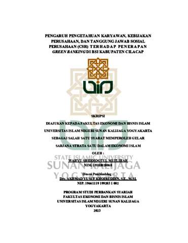Wahyu Shiddiqotul Muflihah, NIM.: 19108020068 (2023) PENGARUH PENGETAHUAN, KEBIJAKAN PERUSAHAAN DAN TANGGUNG JAWAB SOSIAL PERUSAHAAN (CSR) TERHADAP PENERAPAN GREEN BANKING DI BSI KABUPATEN CILACAP. Skripsi thesis, UIN SUNAN KALIJAGA YOGYAKARTA.