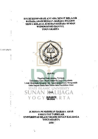 Nuraeni, NIM.: 00420201 (2004) STUDI KOMPARASI ANTARA MINAT BELAJAR BAHASA ARAB DENGAN BAHASA INGGRIS SISWA KELAS II JURUSAN BAHASA DI MAN WONOKROMO BANTUL. Skripsi thesis, UIN SUNAN KALIJAGA YOGYAKARTA.