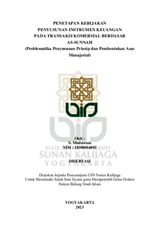 S. Mudawam, NIM.: 18300016092 (2023) PENETAPAN KEBIJAKAN PENYUSUNAN INSTRUMEN KEUANGAN PADA TRANSAKSI KOMERSIAL BERDASAR AS-SUNNAH (PROBLEMATIKA PENYUSUNAN PRINSIP DAN PEMBENTUKAN ASAS MANAJERIAL). Doctoral thesis, UIN SUNAN KALIJAGA YOGYAKARTA.