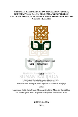 Eka Susi Sulistyowati, NIM: 21204091011 (2023) MADRASAH BASED EDUCATION MANAGEMENT (MBEM) KEPEMIMPINAN DALAM PENGEMBANGAN PRESTASI AKADEMIK DAN NON AKADEMIK SISWA MADRASAH ALIYAH NEGERI 1 KLATEN. Masters thesis, UIN SUNAN KALIJAGA YOGYAKARTA.