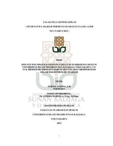 Nurma Audina, S.H., NIM.: 19203012031 (2023) TALAK DI LUAR PENGADILAN ( STUDI FATWA MAJELIS PERMUSYAWARATAN ULAMA ACEH NO 2 TAHUN 2015 ). Masters thesis, UIN SUNAN KALIJAGA YOGYAKARTA.