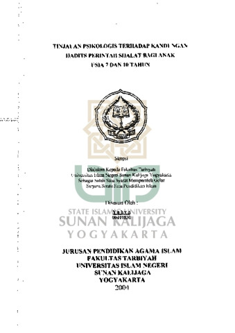 Yahya, NIM.: 00410530 (2004) TINJAUAN PSIKOLOGIS TERHADAP KANDUNGAN HADITS PERINTAH SHALAT BAGI ANAK USIA 7 DAN 10 TAHUN. Skripsi thesis, UIN SUNAN KALIJAGA YOGYAKARTA.