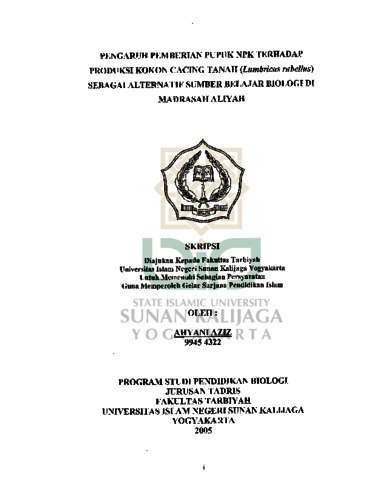 AHYANI AZIZ, NIM. 99454322 (2005) PENGARUH PEMBERIAN PUPUK NPK TERHADAP PRODUKSI KOKON CACING TANAH (Lumbricus rubellus) SEBAGAI ALTERNATIF SUMBER BELAJAR BIOLOGI DI MAADRASAH ALIYAH. Skripsi thesis, UIN SUNAN KALIJAGA.