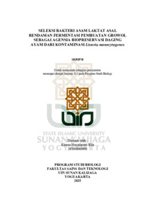 Kirana Hayatiputri Rila, NIM.: 20106040008 (2025) SELEKSI BAKTERI ASAM LAKTAT ASAL RENDAMAN FERMENTASI PEMBUATAN GROWOL SEBAGAI AGENSIA BIOPRESERVASI DAGING AYAM DARI KONTAMINASI Listeria monocytogenes. Skripsi thesis, UIN SUNAN KALIJAGA YOGYAKARTA.