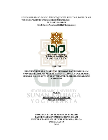 Apris Rahmat Wahyudi, NIM.: 20108020069 (2024) PENGARUH BRAND IMAGE, SERVICE QUALITY, REPUTASI, DAN LOKASI TERHADAP KEPUTUSAN NASABAH MENABUNG DI BANK SYARIAH (STUDI KASUS NASABAH BSI KC BOJONEGORO). Skripsi thesis, UIN SUNAN KALIJAGA YOGYAKARTA.