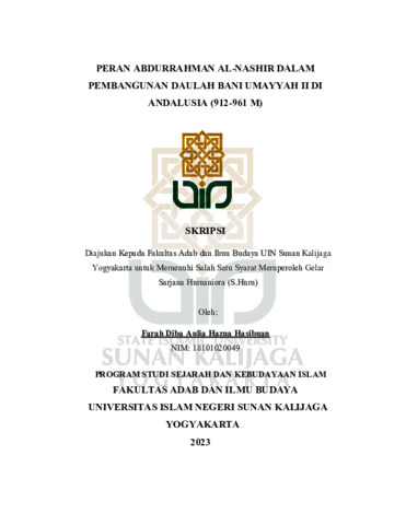 Farah Diba Aulia Hazna Hasibuan, NIM.: 18101020049 (2023) PERAN ABDURRAHMAN AL-NASHIR DALAM PEMBANGUNAN DAULAH BANI UMAYYAH II DI ANDALUSIA (912-961 M). Skripsi thesis, UIN SUNAN KALIJAGA YOGYAKARTA.
