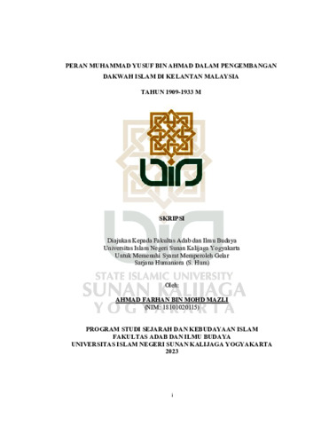 Ahmad Farhan Bin Mohd Mazli, NIM.: 18101020115 (2023) PERAN MUHAMMAD YUSUF BIN AHMAD DALAM PENGEMBANGAN DAKWAH ISLAM DI KELANTAN MALAYSIA TAHUN 1909-1933 M. Skripsi thesis, UIN SUNAN KALIJAGA YOGYAKARTA.