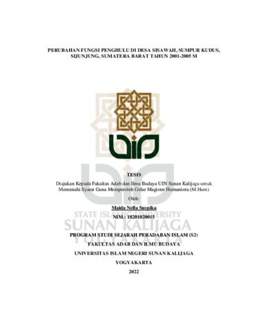 Maida Nella Suspika, NIM.: 18201020015 (2022) PERUBAHAN FUNGSI PENGHULU DI DESA SISAWAH, SUMPUR KUDUS, SIJUNJUNG, SUMATERA BARAT TAHUN 2001-2005 M. Masters thesis, UIN SUNAN KALIJAGA YOGYAKARTA.