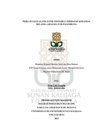 Wela Celsi Anggela, NIM.: 20201021001 (2023) PERLAWANAN ULAMA ETNIS TIONGHOA TERHADAP KOLONIAL BELANDA ABAD KE-19 DI PALEMBANG. Masters thesis, UIN SUNAN KALIJAGA YOGYAKARTA.