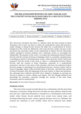 Noor Hamid, - (2024) The Relationship Between Islamic Dawah And The Concept Of Islam Nusantara In A Multicultural Perspective. Ath-Thariq: Jurnal Dakwah dan Komunikasi, 8 (1). pp. 17-29. ISSN (e-ISSN 2614-8439) (ISSN 2580-1651)