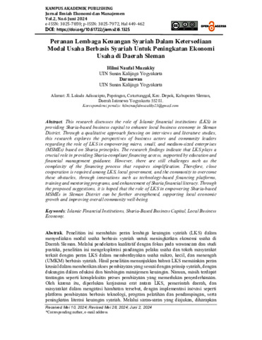 This research discusses the role of Islamic financial institutions (LKS) in providing Sharia-based business capital to enhance local business economy in Sleman District. Through a qualitative approach focusing on interviews and literature studies, this research explores the perspectives of business actors and community leaders regarding the role of LKS in empowering micro, small, and medium-sized enterprises (MSMEs) based on Sharia principles. The research findings indicate that LKS plays a crucial role in providing Sharia-compliant financing access, supported by education and financial management guidance. However, there are still challenges such as the complexity of the financing process that requires simplification. Therefore, close cooperation is required among LKS, local government, and the community to overcome these obstacles, through innovations such as technology-based financing platforms, training and mentoring programs, and enhancement of Sharia financial literacy. Through the proposed suggestions, it is hoped that the role of LKS in empowering Sharia-based MSMEs in Sleman District can be further strengthened, supporting local economic growth and improving overall community well-being. Penelitian ini membahas peran lembaga keuangan syariah (LKS) dalam menyediakan modal usaha berbasis syariah untuk meningkatkan ekonomi usaha di Daerah Sleman. Melalui pendekatan kualitatif dengan fokus pada wawancara dan studi pustaka, penelitian ini mengeksplorasi pandangan pelaku usaha dan tokoh masyarakat terkait dengan peran LKS dalam memberdayakan usaha mikro, kecil, dan menengah (UMKM) berbasis syariah. Hasil penelitian menunjukkan bahwa LKS memainkan peran krusial dalam memberikan akses pembiayaan yang sesuai dengan prinsip syariah, dengan dukungan dalam edukasi dan bimbingan manajemen keuangan. Namun, masih terdapat tantangan seperti kompleksitas proses pembiayaan yang memerlukan penyederhanaan. Oleh karena itu, diperlukan kerjasama erat antara LKS, pemerintah daerah, dan masyarakat dalam mengatasi hambatan tersebut, dengan implementasi inovasi seperti platform pembiayaan berbasis teknologi, program pelatihan dan pendampingan, serta peningkatan literasi keuangan syariah. Melalui saran-saran yang diajukan, diharapkan peran LKS dalam pemberdayaan UMKM berbasis syariah di Daerah Sleman dapat semakin diperkuat, mendukung pertumbuhan ekonomi lokal, dan meningkatkan kesejahteraan masyarakat secara keseluruhan.