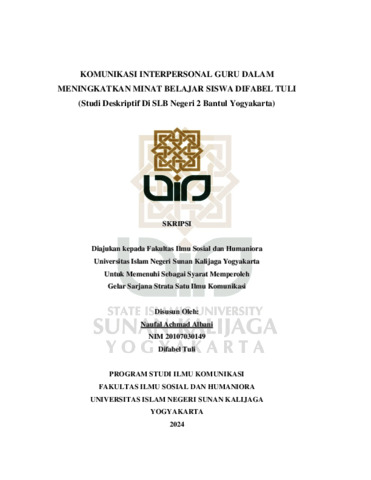 Naufal Achmad Albani, NIM.: 20107030149 (2024) KOMUNIKASI INTERPERSONAL GURU DALAM MENINGKATKAN MINAT BELAJAR SISWA DIFABEL TULI (Studi Deskriptif di SLB Negeri 2 Bantul Yogyakarta). Skripsi thesis, UIN SUNAN KALIJAGA YOGYAKARTA.