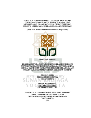 Prisma Zuhri Saputra, NIM.: 19108030093 (2024) PENGARUH PERSEPSI MANFAAT, PERSEPSI KEMUDAHAN PENGGUNAAN, DAN PERSEPSI RISIKO TERHADAP NIAT MENGGUNAKAN ISLAMIC FINANCIAL PRODUCTS DENGAN PERSEPSI KEPERCAYAAN SEBAGAI VARIABEL MODERASI (STUDI PADA MAHASISWA DI DAERAH ISTIMEWA YOGYAKARTA). Skripsi thesis, UIN SUNAN KALIJAGA YOGYAKARTA.