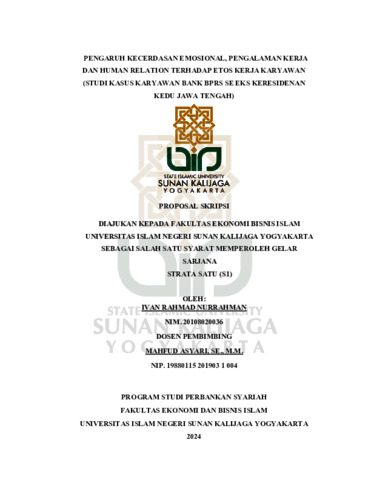 Ivan Rahmad Nurrahman, NIM.: 20108020036 (2024) PENGARUH KECERDASAN EMOSIONAL, PENGALAMAN KERJA DAN HUMAN RELATION TERHADAP ETOS KERJA KARYAWAN (STUDI KASUS KARYAWAN BANK BPRS SE EKS KERESIDENAN KEDU JAWA TENGAH). Skripsi thesis, UIN SUNAN KALIJAGA YOGYAKARTA.