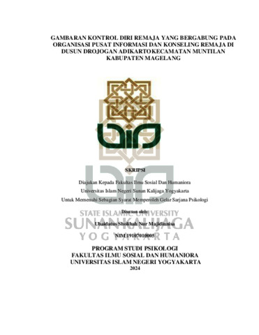 Ubaidatus Sholihah Nur Majidinnisa, NIM.: 19107010005 (2024) GAMBARAN KONTROL DIRI REMAJA YANG BERGABUNG PADA ORGANISASI PUSAT INFORMASI DAN KONSELING REMAJA DI DUSUN DROJOGAN ADIKARTO KECAMATAN MUNTILAN KABUPATEN MAGELANG. Skripsi thesis, UIN SUNAN KALIJAGA YOGYAKARTA.